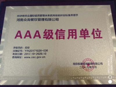• 18-02-10熱烈祝賀河南眾海餐飲管理有限公司榮獲河南餐飲與飯店協會團餐委